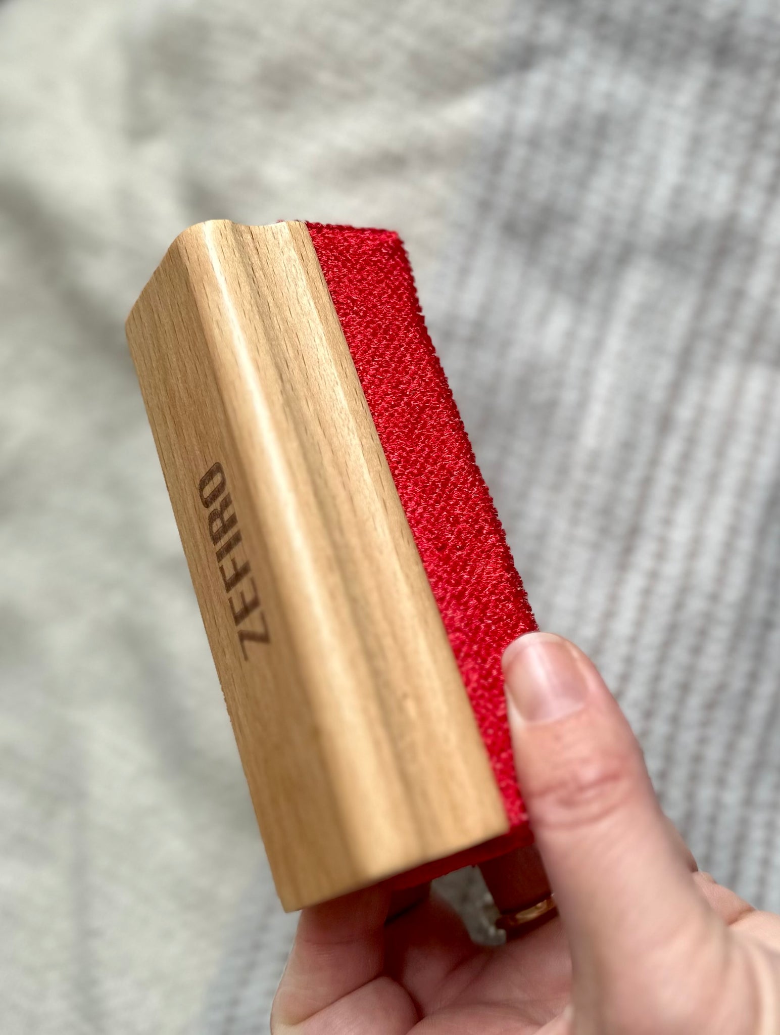 Our fuzz remover is made from beechwood and a polyester velvet.
